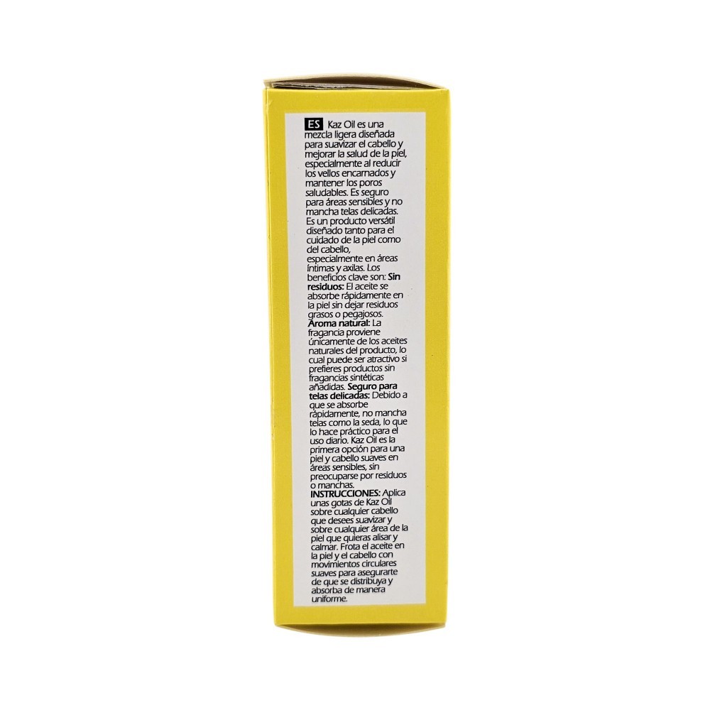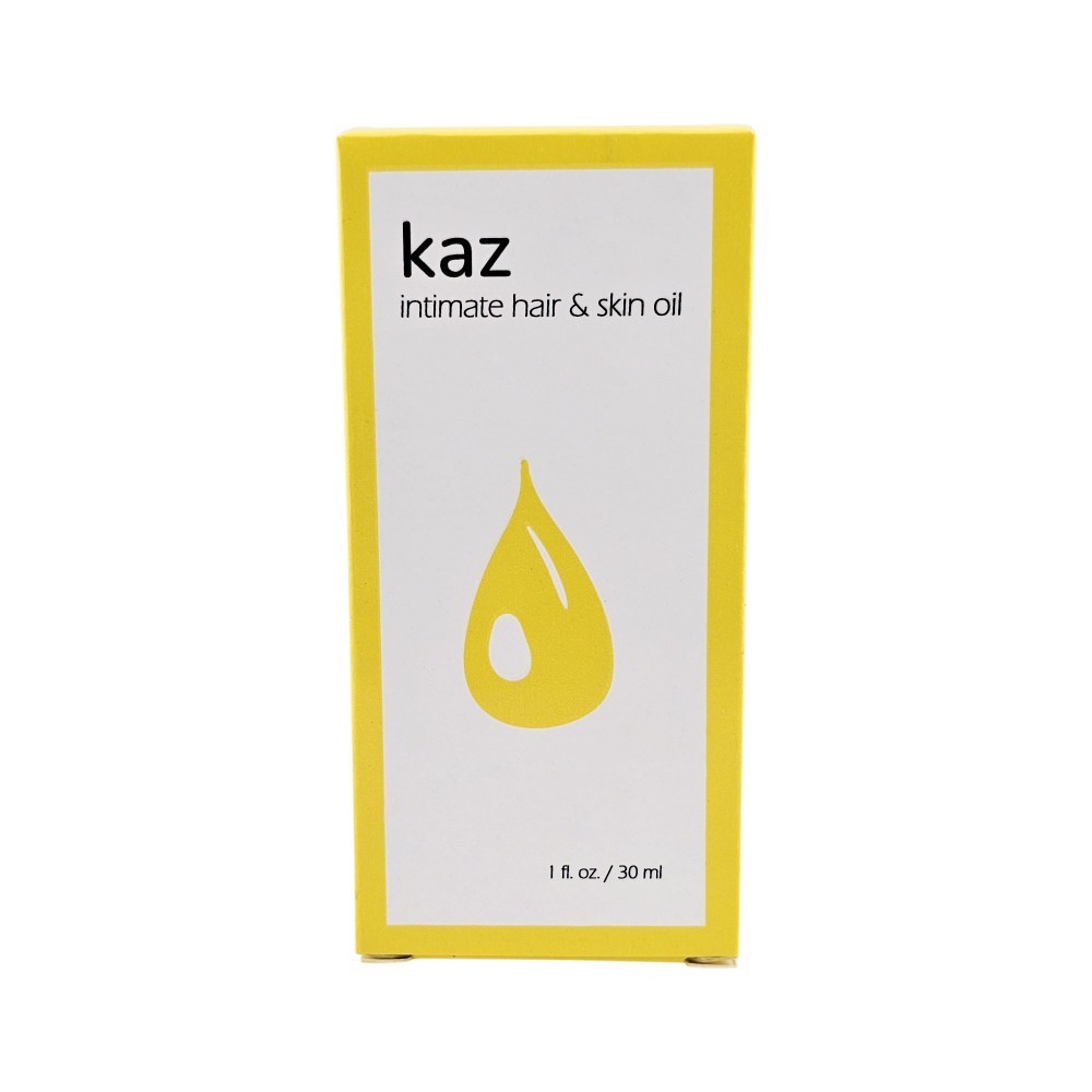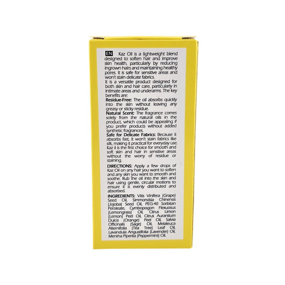 Kaz Oil is a lightweight blend designed to soften hair and improve skin health, particularly by reducing ingrown hairs and maintaining healthy pores. It is safe for sensitive areas and won't stain delicate fabrics.