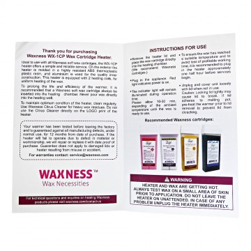 To prolong the life and elficiency of the warmer, it is recommended a Wax Necessities soft wax cartridge always be inserted into the heating chamber. Never pour wax directly into the heating well. To maintain optimum condition of the heater, clean regularly. Use Wax Necessities Citrus Cleaner for heavy wax residues. Do not use Citrus Cleaner directly on the `Wax Necessities` LOGO printed on the heater. Your warmer has been tested before leaving the factory and is guaranteed against all manufacturing defects, under normal use, for 12 months from date of purchase. If the heater will fail to operate due to defect in material or workmanship, we will repair or replace it with date proof of purchase. Guarantee does not apply to damaged lids or heater resulting from misuse or accident.